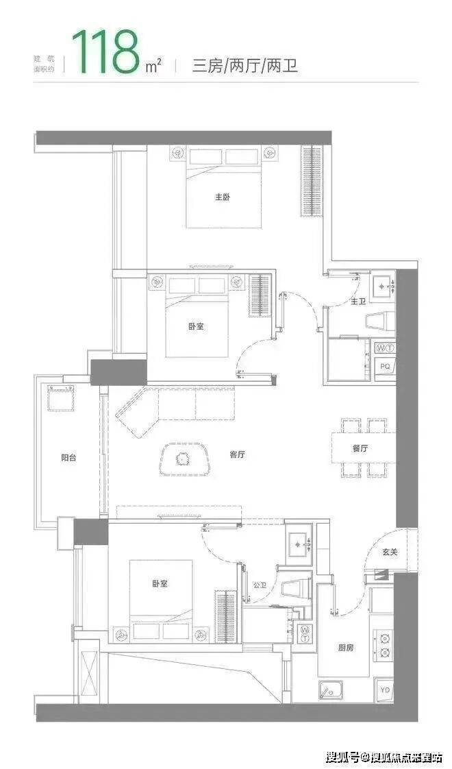 118㎡三房两厅两卫:采用双龙抱珠设计,仅有 64 套,客厅、卧室均朝西南,采光面足。