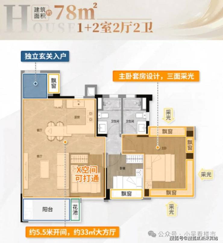 建面78平,南向约11米采光,四开间朝南,独立入户玄关,主卧270度景观飘窗,三面采光,还可做成33平的大客厅