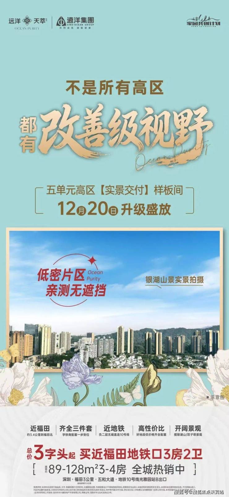 项目由远洋集团打造,位于坂田街道五和大道与光雅园路交汇处东北侧,紧邻地铁10号线光雅园站B出口。总占地面积约1.36万㎡,共由4栋总高44-47层的住宅+1栋34层的办公组成:其中,1栋1、2单元为47层住宅,5单元为45层住宅,约615套住宅(含50套回迁房);1栋4单元为41层人才房,共180套人才房;1栋3单元为34层写字楼;2栋规划为3层幼儿园。