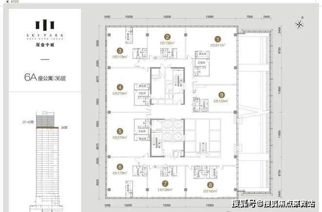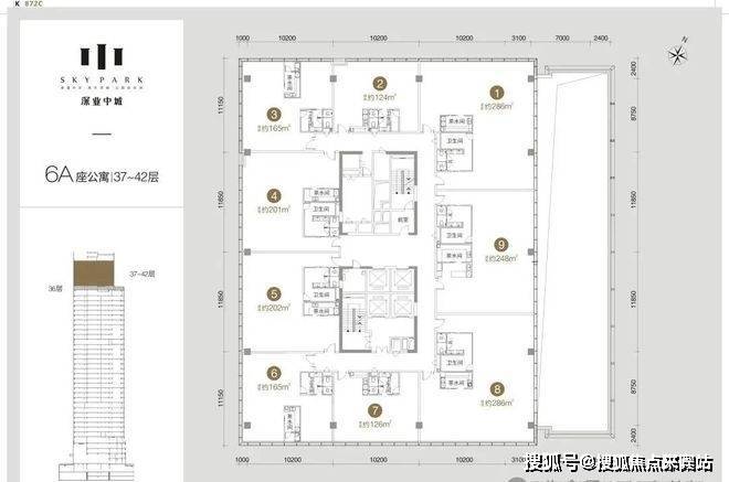 6A栋户型和分布:总高度184米,总高42层,1-4楼商业,5楼花园,6-34楼写字楼(现为华为荣耀办公楼),36-42层正在售的商务公寓,面积:124-126-165-202-248-286