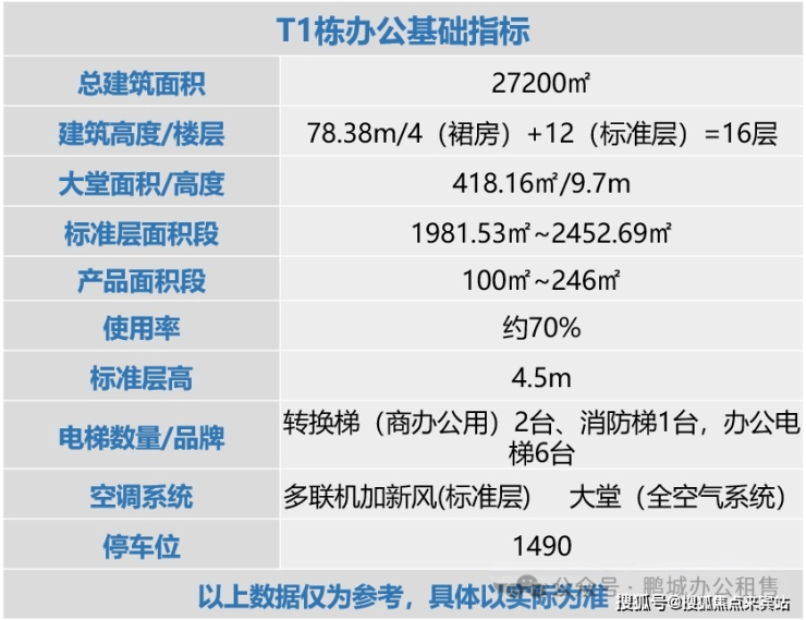 T1栋办公区域的建筑面积约为27200平方米,建筑高度约78米,符合100米的限高要求。该建筑的第5层至第16层