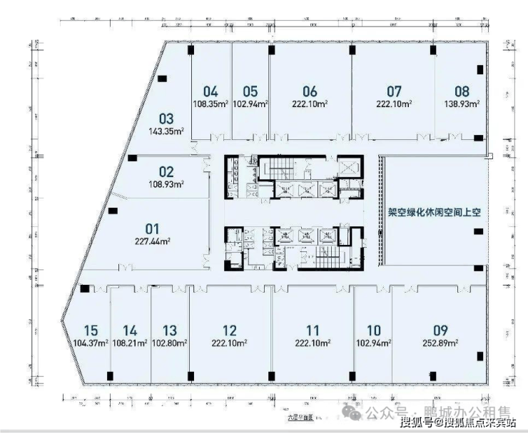 标准层占地面积约为2747平方米,总计24个办公单位,每个单位的产权面积介于67至236平方米之间。