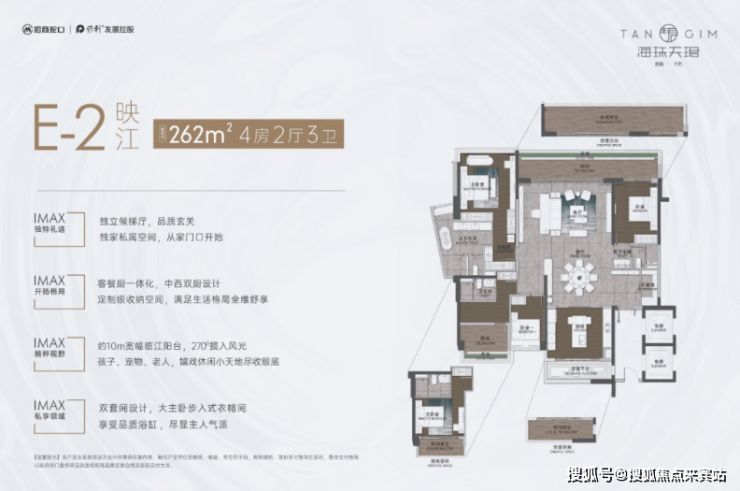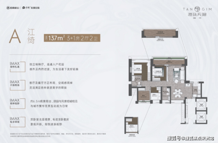 产品主打 137-262㎡三至四房,涵盖高区 262㎡天幕大平层与顶楼 418㎡稀缺顶复,3.3 米层高、南北对流,LDKB 一体化通透格局,匹配塔尖人居需求。公建化玻璃幕墙外立面,搭配酒店式大堂与保利一级物业,社区配建幼儿园及商业配套,周边环伺万胜广场、三甲医院与全龄名校,自住与收藏价值兼具。