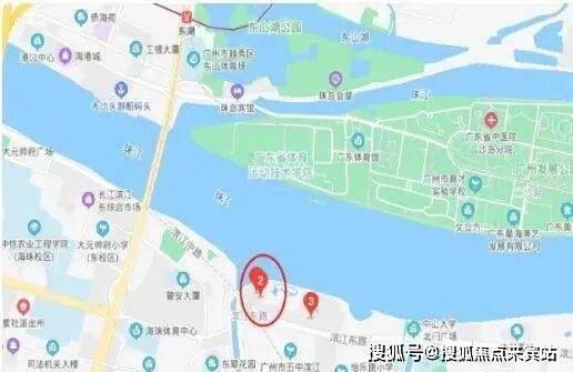 东面为珠江泳场水上乐园和规划中的综合楼,再往东为已建成的一期、二期和三期的高尚住宅,地块看上去拥有探出江面的半岛之势。