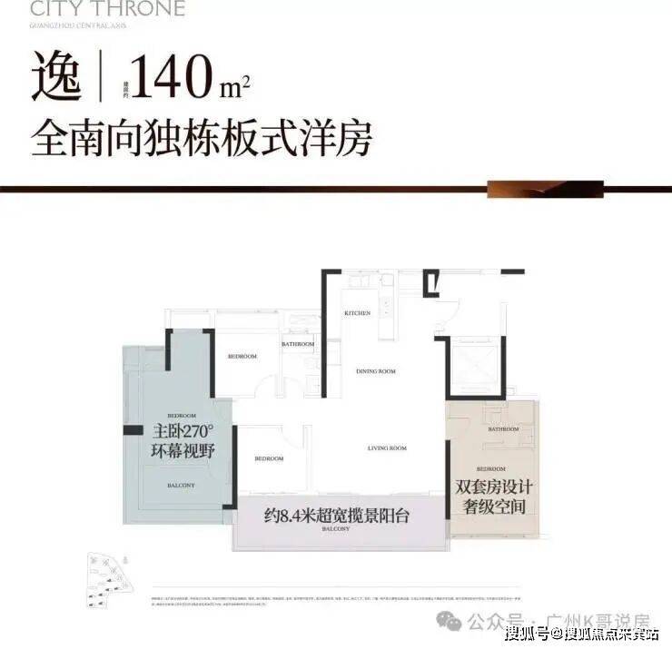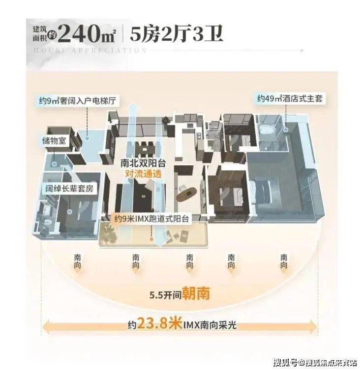 其三,270°飘窗+约8.4米南向巨幕阳台+双南向套房,户型很惊艳这个户型,四开间朝南,也是改善客户的首选。
