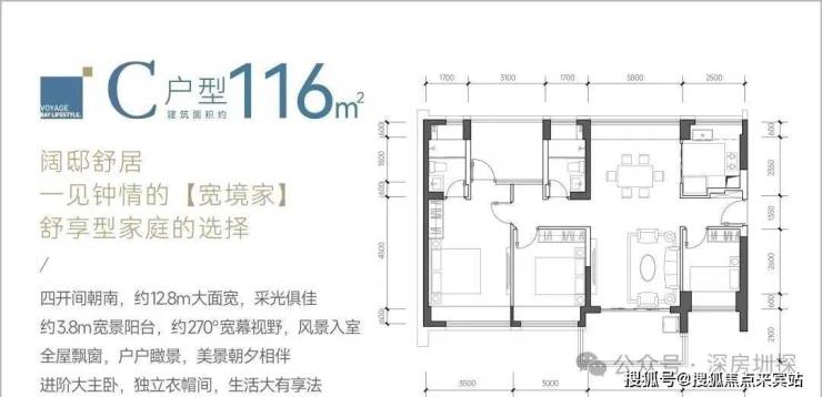116㎡的4房2厅2卫,C户型,设计的是竖厅南北通透格局,餐客厅一体化设计,客厅3.8米开间,四开间朝南,4个卧室分别做到了主卧17.85㎡/次卧11.4㎡/次卧9.3㎡/次卧8㎡(包含墙体飘窗),都不用搭配飘窗做床,U型厨房,卫生间干湿分离,得房率约:93.13%(包含赠送),阳台主朝西南、东南或正南向。