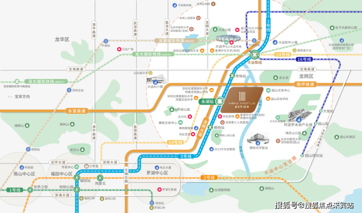地铁:与地铁3号线永湖站无缝接驳,距离仅约150米;2站达大运枢纽,可换乘14号线、16号线及深大城际