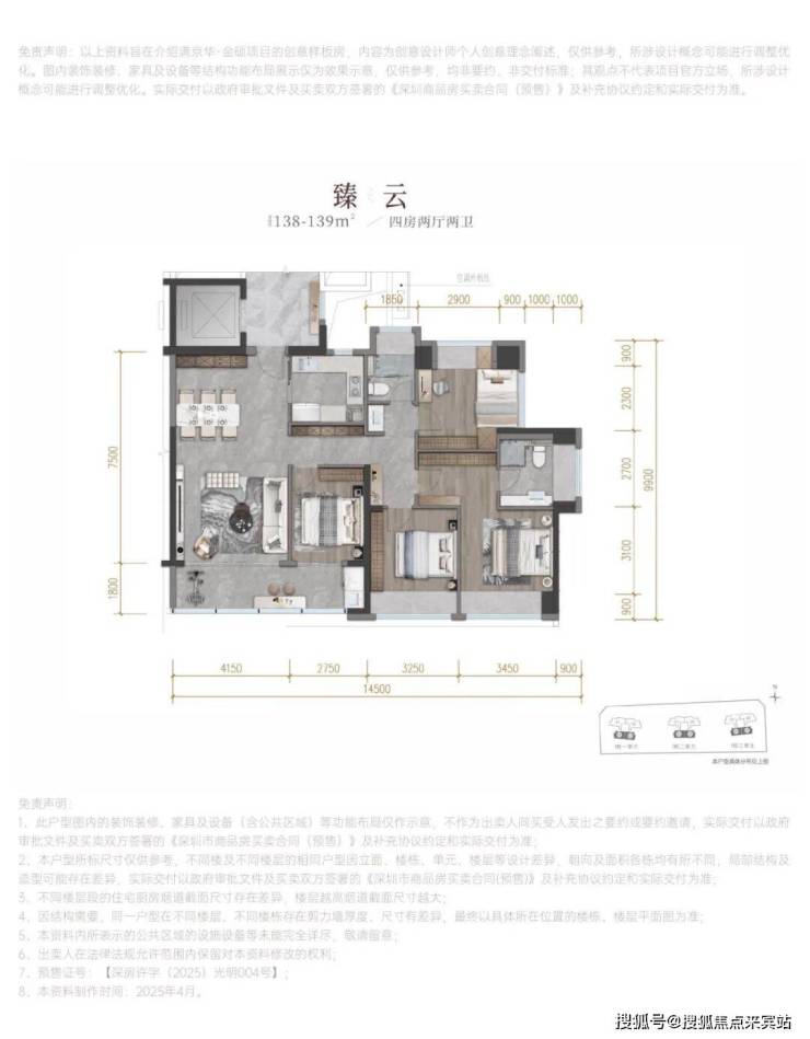 138-139㎡的户型,折后单价约4.83-5.16万/㎡,折后总价约666-717万/套;