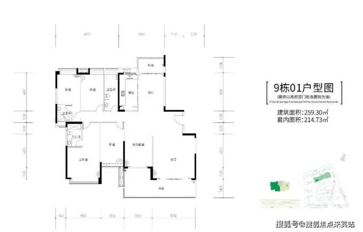 9栋,两梯两户,建面约255-259㎡五房大平层户型