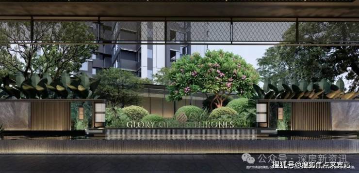 小区大门整体以“皇冠”为造型打造。搭配汉白玉雕塑、安哥拉黑大理石、罗汉松,紫山水奢石,带给业主尊贵的第一道归家礼序。