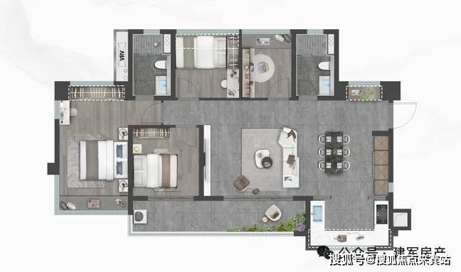 106㎡的4房2厅2卫,设计的是横厅南北通透格局,客餐厅开间5.6米,餐厨一体化,约13.7米超幕视野,超长阳台,主卧转角270°大飘窗,只有2栋07户型才有,得房率:78.99%(不含赠送),阳台主朝西南向。