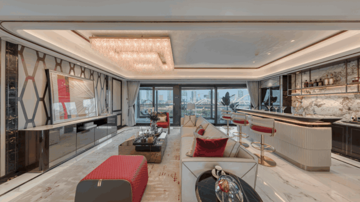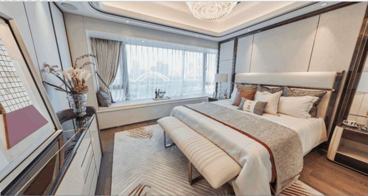 当中,270°观景的绝佳体验也被引进了主卧,瞰景而眠,枕景入梦,约11.9米的奢华进深,包揽下所有享受。