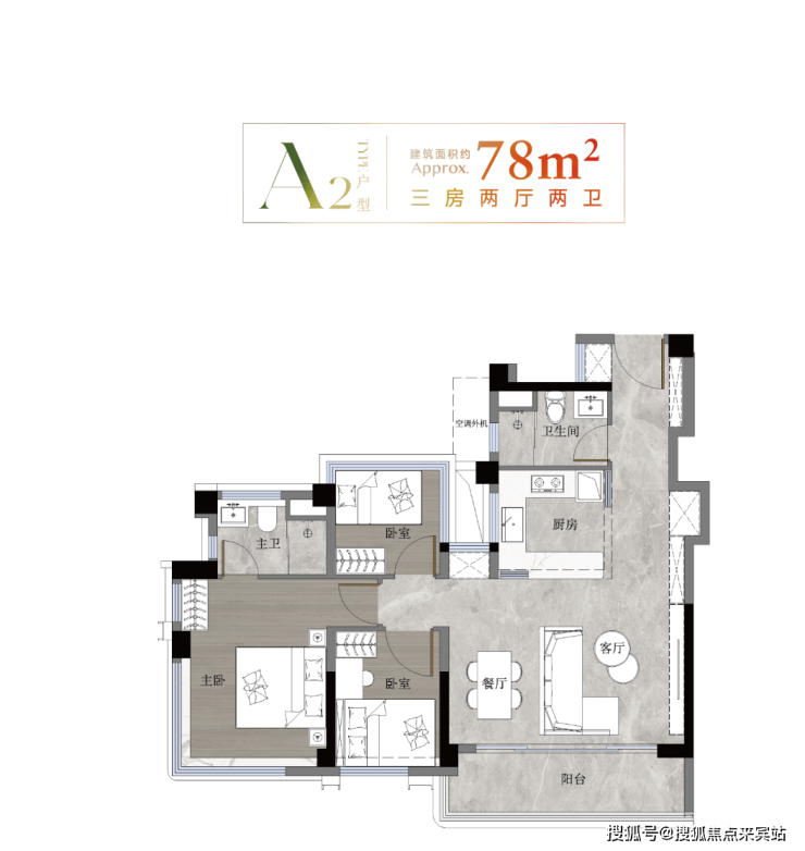 78㎡三房两卫入门级产品,让刚需花小钱就能享受到央企品质和高使用率;