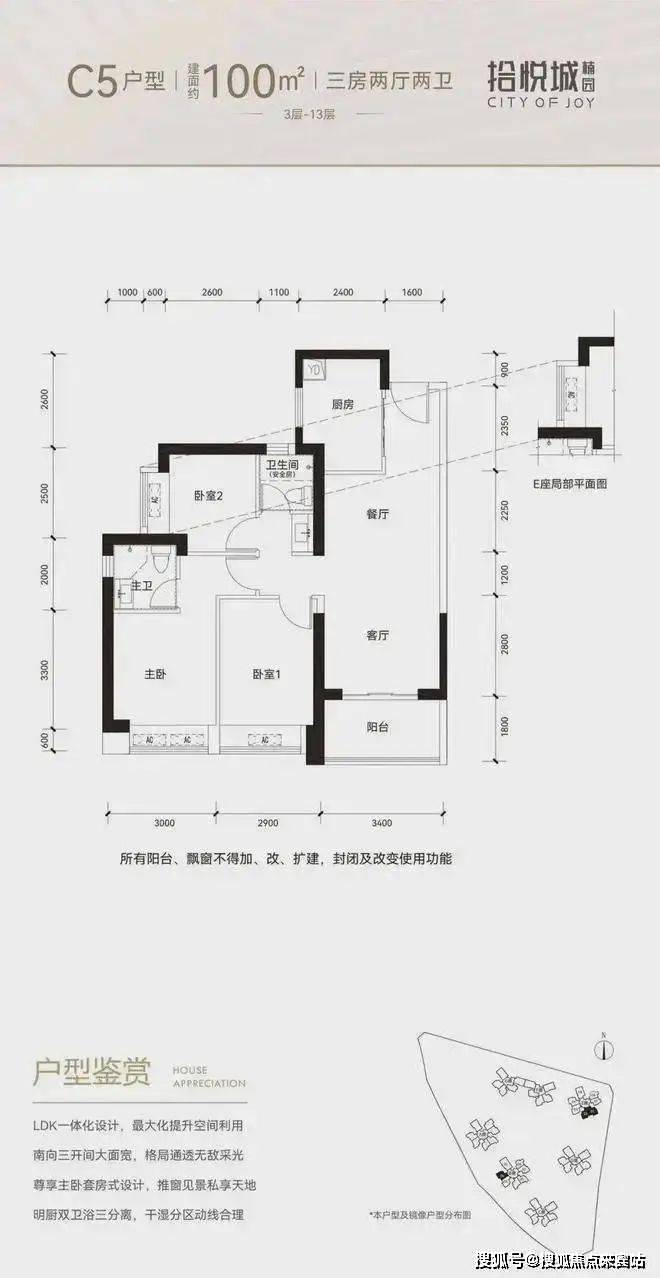100平三房:设计的是竖厅格局,进门入户玄关拾悦城楠园,客厅3.4米开间,LDKB一体化设计,3个卧室分别做到了3米/2.9米/2.5米的宽度,U型厨房,公卫三段式分离,得房率:77.14%(不含赠送),阳台1.8米宽度,西南或东南朝向。