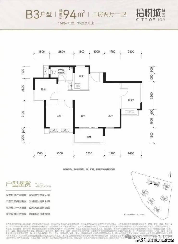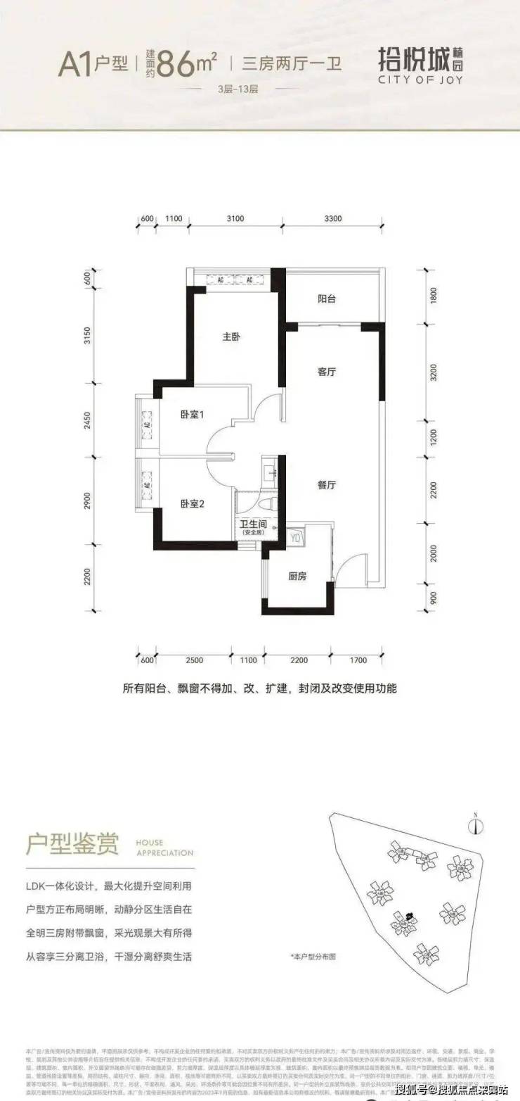 86平三房:设计的是竖厅格局,进门入户玄关拾悦城楠园售楼处热线400-859-7606,客厅3.3米开间,LDKB一体化设计,3个卧室分别做到了3.1米/2.9米/2.45米的宽度,U型厨房,卫生间三段式分离,得房率:76.92%(不含赠送),阳台1.8米宽度,东北朝向。