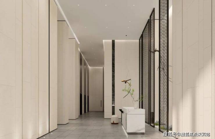 入户大堂内使用哑光面、温润面及雕刻面的天然大理石交互铺贴,功能涵盖茶室、书吧等;