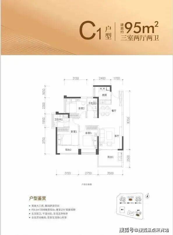 95㎡的3房2厅2卫,设计的是经典竖厅格局,客厅3.5米开间,进深8.35米,LDKB一体化设计,三开间朝南,3个卧室分别做到了主卧13.8㎡/次卧10.31㎡/次卧9.13㎡(包含墙体飘窗),U型厨房,公卫三段式分离,得房率约90%(包含赠送),西南或正南朝向。
