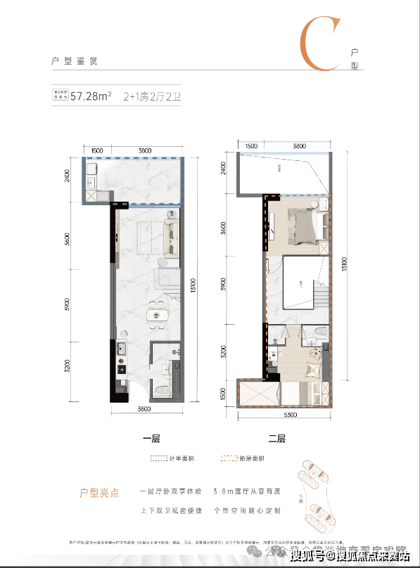 C户型:建筑面积约57.28㎡,2+1房2厅2卫↓