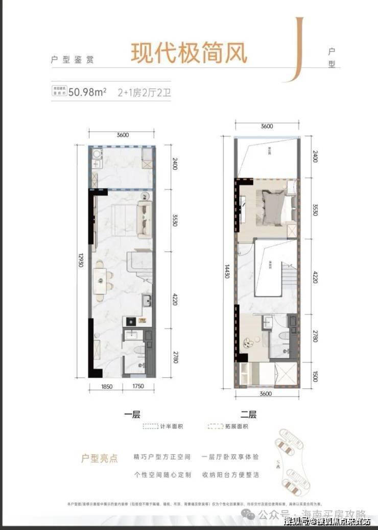 J户型:建筑面积约50.98㎡,2+1房2厅2卫↓