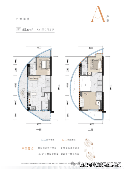 A户型:建筑面积约63.6㎡,3+1房2厅4卫↓