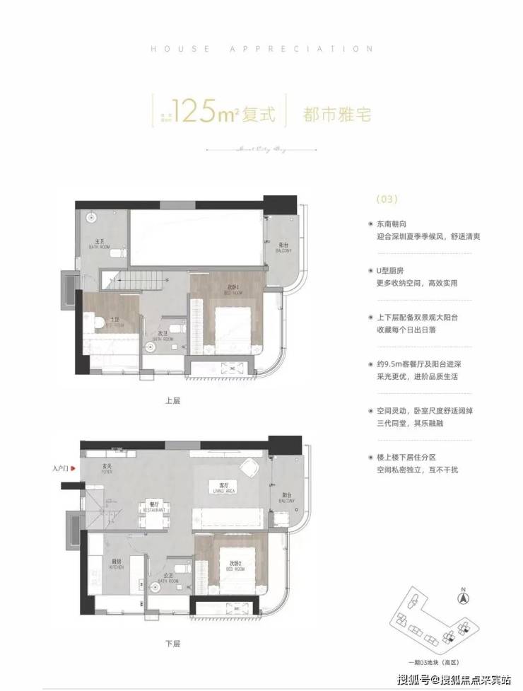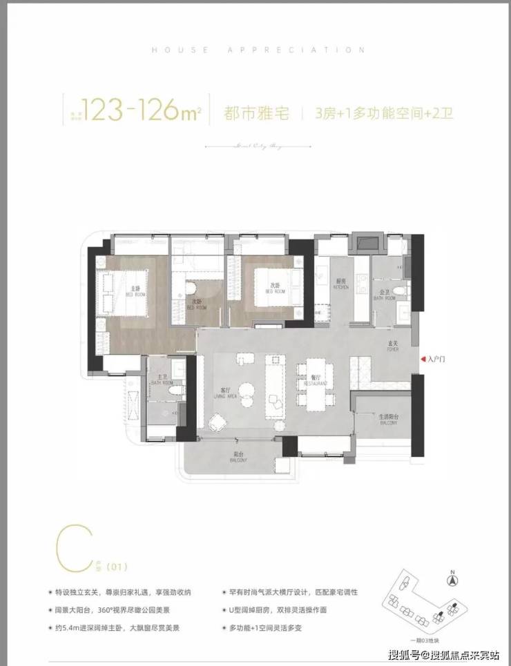 尤其约6.7米开间双面宽大景观阳台设置,以及主卧带大拐角飘窗,外加中西厨及岛台设计,对建面约125平的户型来说非常豪华了,这才是真正的城市核心改善型户型。