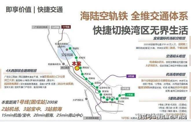 交通:项目步行约200米就是1号线固戍站。(来源:百度地图测距)由此出发,约2站可达深圳机场、约4站可达宝安中心、6站可达前海核心区,还可快速通达机场福永码头、大铲湾码头。