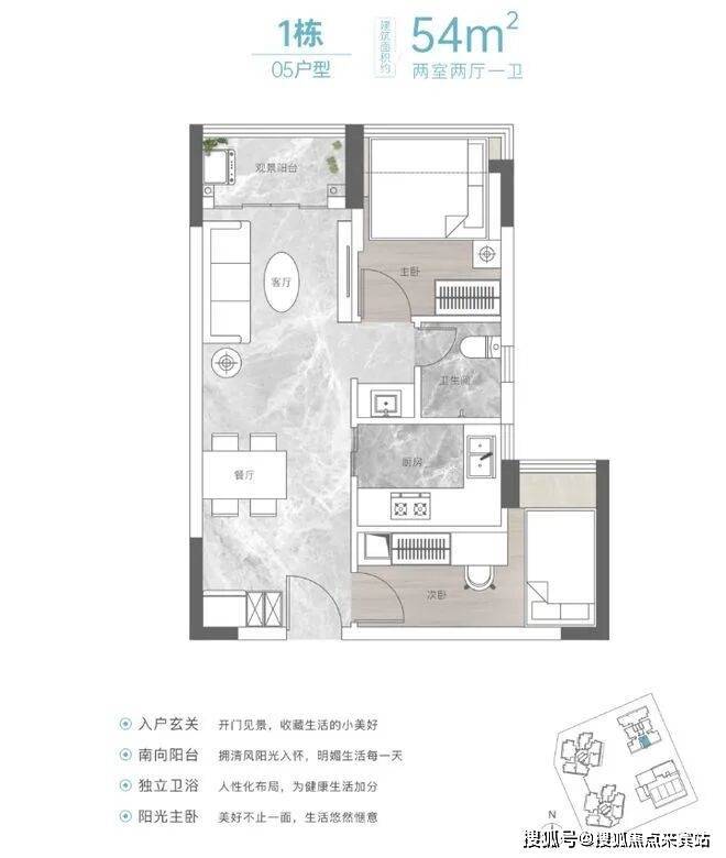 ②建面约64㎡是竖厅的两房两厅一卫户型,对比那个54㎡的户型,这个功能间布局就传统多了,多了10个㎡,同样也具有低总价优势。