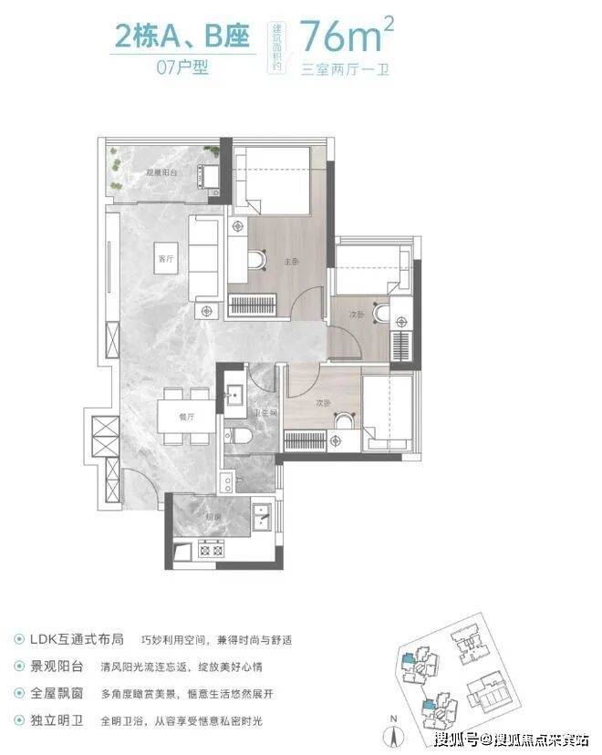 ③建面约76㎡是竖厅三房两厅一卫户型,结构比较传统,功能间布局合理,实用性比较强,比较适合预算有限的刚需家庭,预计这个户型会比较抢手。