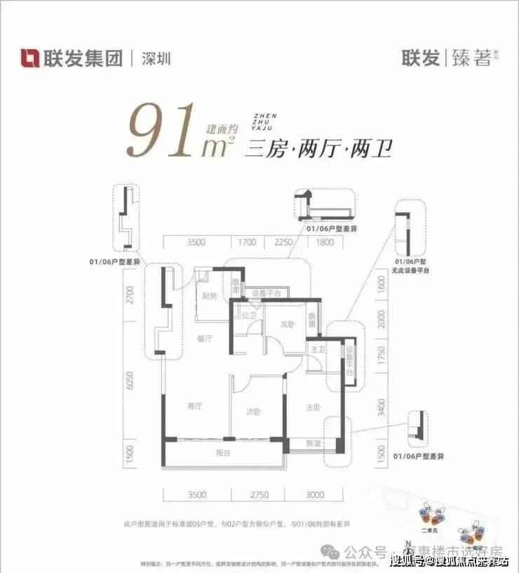 91㎡的3房2厅2卫,设计的是经典竖厅格局,客厅3.5米开间,三开间朝南,3个卧室分别是3米/2.75米/2.25米的宽度,U型厨房,公卫三段式分离设计,得房率:92.69%(包含赠送),阳台西北或东北朝向。