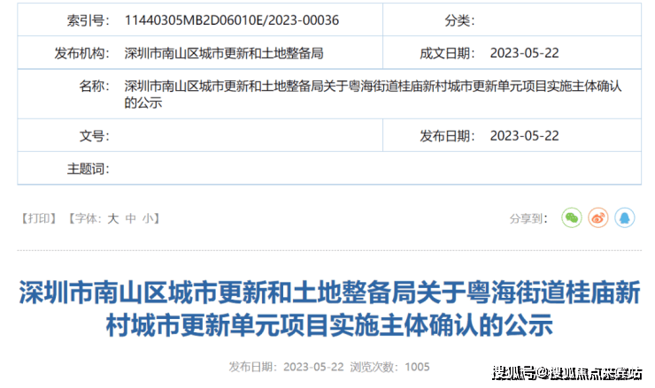 桂庙新村城市更新单元项目于2021年3月发布规划公告,申报主体为深圳市南岗实业股份有限公司,项目实施主体拟确认为深圳市贯凯投资有限公司。