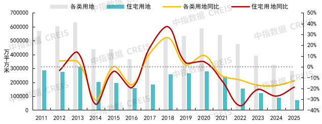 住宅用地:根据中指数据,2025年,300城住宅用地推出规划建筑面积为7.3亿平方米,同比下降18.7%,降幅较2024年收窄8.3个百分点;成交6.2亿平方米,同比下降13.5%,降幅较2024年收窄9.2个百分点。出让金方面,2025年,住宅用地出让金2.3万亿元,同比下降10.6%。