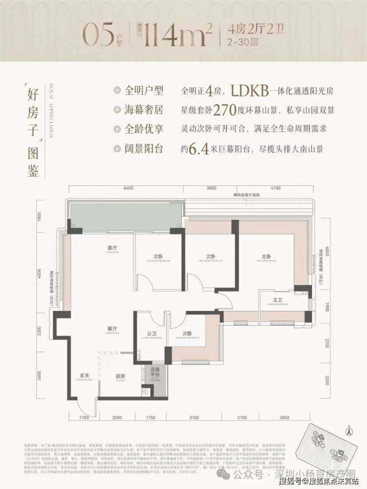 114㎡的4房2厅2卫,设计的是竖厅格局,客厅3.7米开间,LDKB一体化,客厅双面采光,凹墙设计预留冰箱卡槽位,动静分区,分别做到了主卧20.39㎡/次卧12㎡/次卧9.3㎡/次卧8.64㎡(包含墙体飘窗),L型厨房还带1个设备平台约2.86㎡,卫生间干湿分离,得房率约81.4%(不含赠送),客厅连接次卧出6.4米长的大阳台约11.52㎡,东北朝向。 套内面积93.33㎡+飘窗17.25㎡+阳台5.76㎡+设备平台2.86㎡=实得面积119.2㎡,加上赠送后得房率约103.9%。