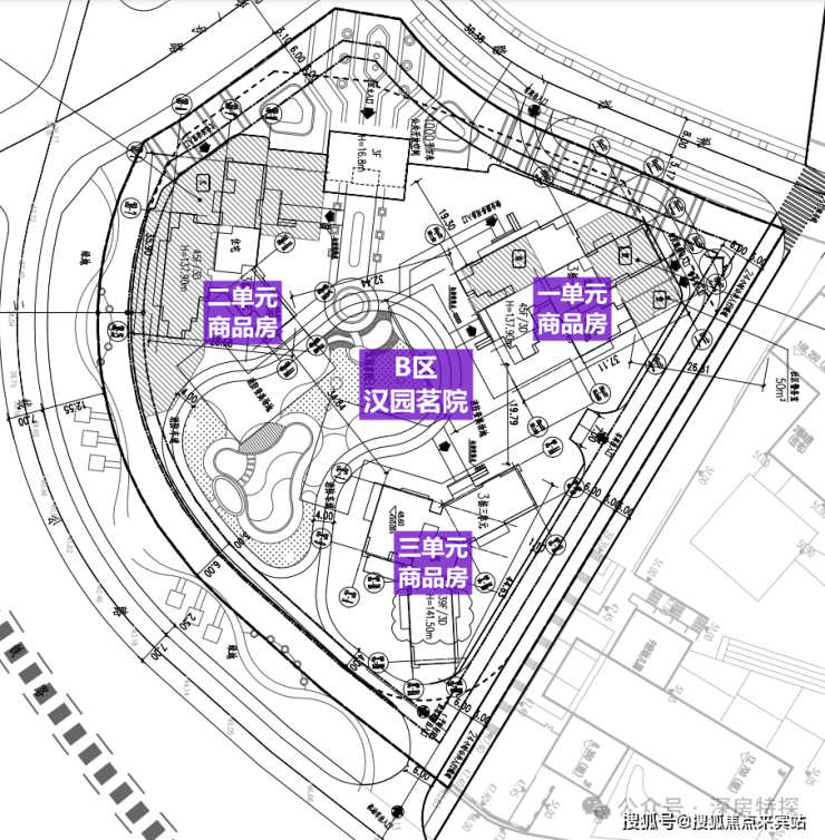 汉园茗院分两个地块A区和B区,A 区是由4栋高层住宅和1栋保障房组成