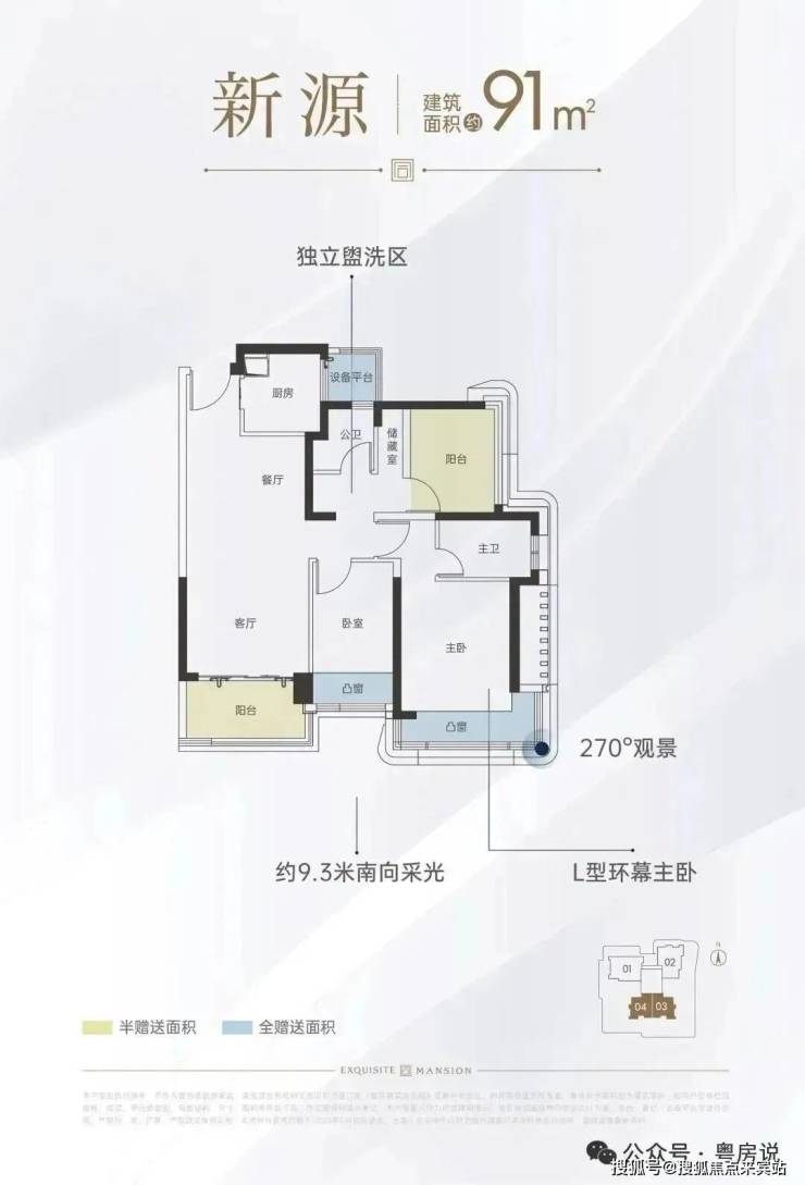 91㎡的3房2厅2卫,设计的是经典竖厅格局,进门入户玄关,客厅3.3米开间,LDKB一体化设计,动静分区,三开间朝南,主卧转角飘窗带1个设备平台,U型厨房,公卫三段式干湿分离,还带1个设备平台,得房率约74.5%(不含赠送),正南朝向。加上赠送约90%得房率。
