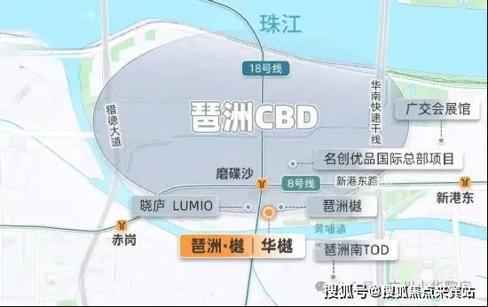 最近的地铁,还是琶洲西区最核心、8/18号线双线交汇的磨碟沙地铁站,仅隔着一条新港东路,直线距离约200米。