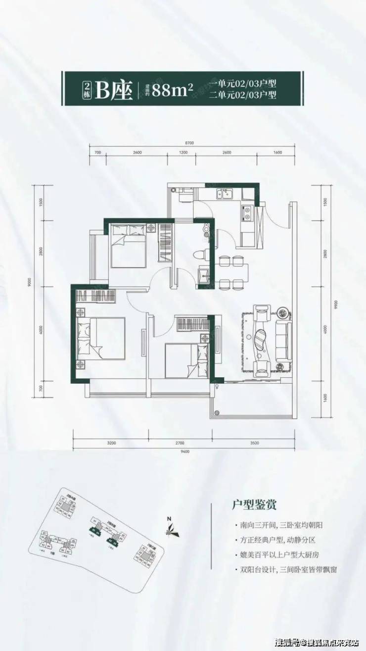 88㎡三房:南向采光,双卫设计,但厨房无生活阳台,实用性打折扣。