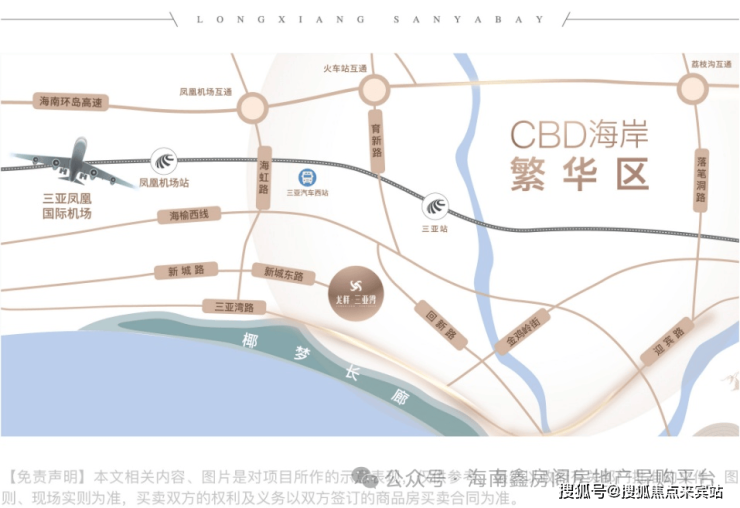 通达路网——南侧与新城东路、三亚湾路、东侧与迎宾路延长线直接接驳。距离凤凰机场10分钟,距离动车站15分钟,距离环岛高速10分钟。行车至主城区各大核心商圈(迎宾路商圈、解放路商圈、大东海商圈)均30分钟内可达。