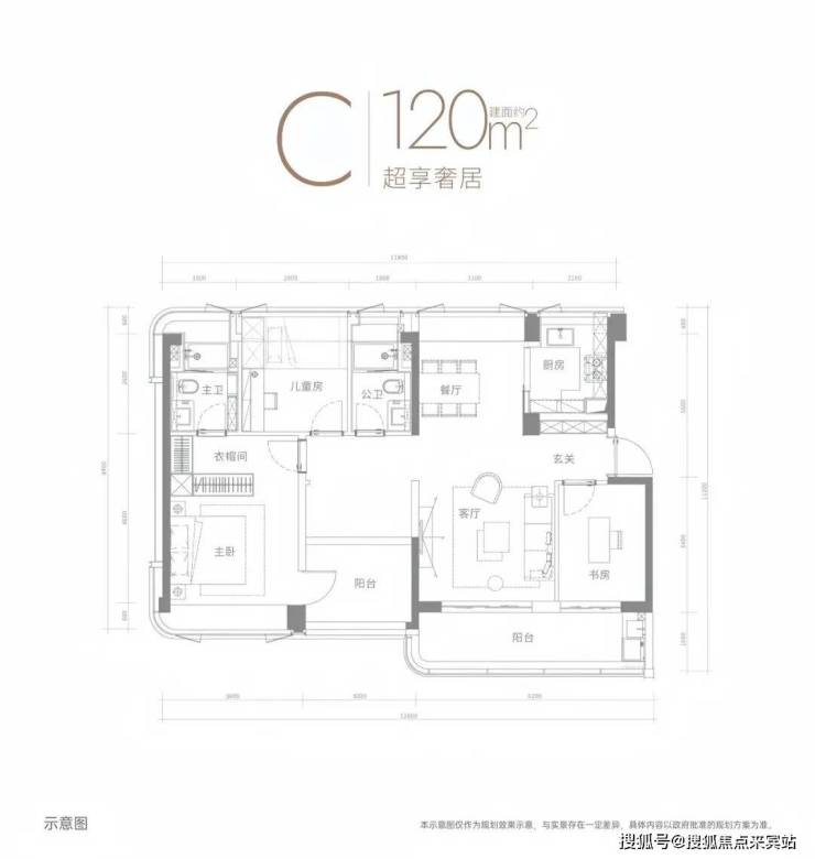 120㎡的4房2厅2卫,南北通透设计,玄关入户,客厅3.585米宽,餐客厅独立,四室朝南(主卧17.83m²/次卧11.16m²/次卧8.84m²/次卧7.04m²),U型厨房,卫生间干湿分区,得房率75.91%,客厅连卧室6.2米阳台9.92m²,朝向西南或东南。