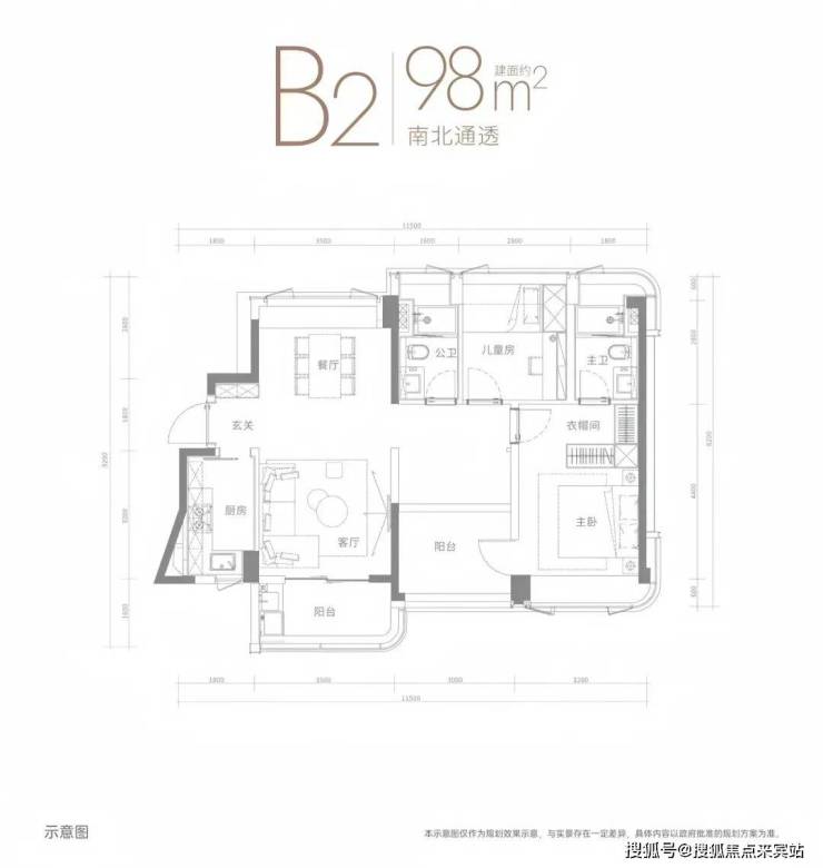 98㎡的3房2厅2卫,南北通透横厅,玄关入户。客厅3.28米宽,四室朝南,动静分区。主卧15.13m²/次卧10.85m²/次室8.25m²(含飘窗)。L型厨房,卫生间干湿分离。得房率75.91%(不含赠送),阳台5.6m²,西南或东南向。