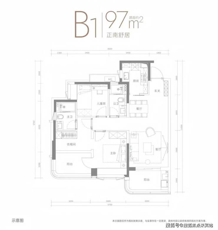 97㎡的3房2厅2卫,竖厅设计,客厅3.295米宽,LDKB一体,三室朝南。主卧13.02m²,次卧10.83m²和7.85m²(去墙面积),U型厨房,卫干湿分区,得房率76.55%(不含赠),阳台6.65m²朝南观园。
