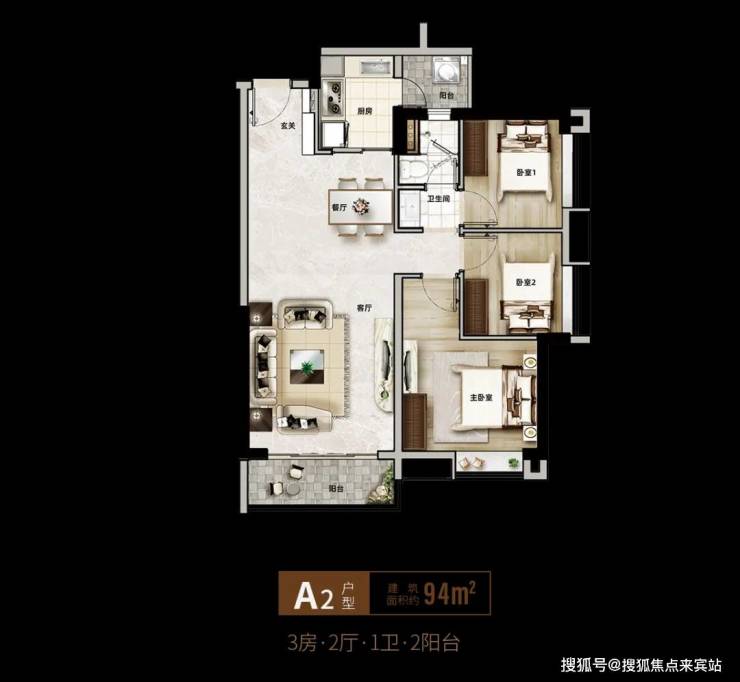 【建面约94㎡三房两厅一卫双阳台】