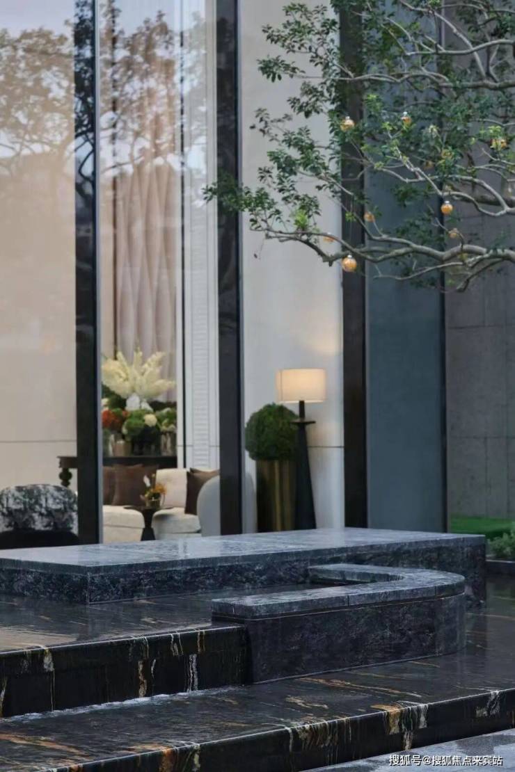跌水水景石材采用拿破仑黑金以及铂金钻大理石,通过石材的天然质感和水的流动,实现刚柔并济的美学平衡。