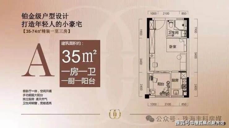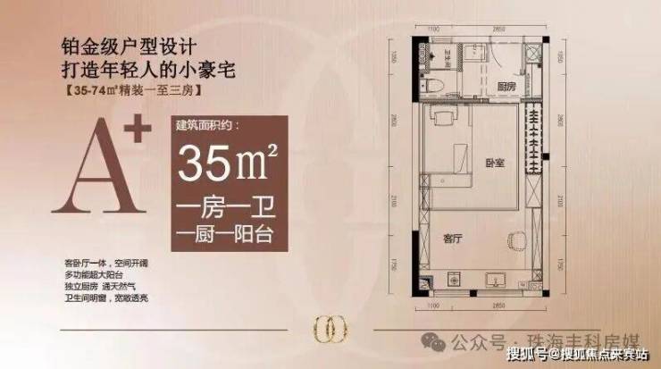 实用率最高约113%。栖澳湾畔推出的户型,包括约35㎡、约50㎡、约64㎡、约74㎡一至三房单位,设计颇为精巧。其中约35㎡分为A和A+户型,均为一房设计,比较单身贵族青年。空间方正好用,可打造出独立阳台、独立厨房,生活井然有序。