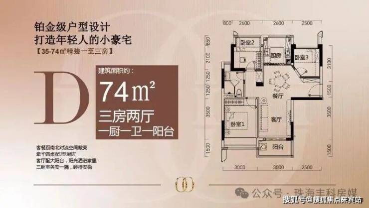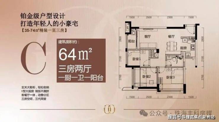 约64㎡、约74㎡户型,为三房两厅一卫,能够满足三代同堂需求。