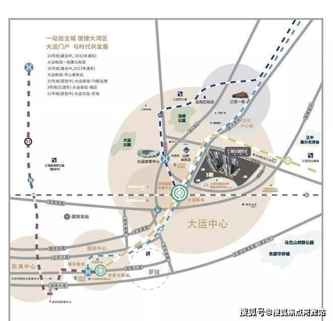 交通:【大运枢纽站】规划4轨与此交汇。3-14-16号线(已开通)33号线(建设中中6站直达机场),乘坐14号线可8站至福田,实现龙岗与福田快速通达。