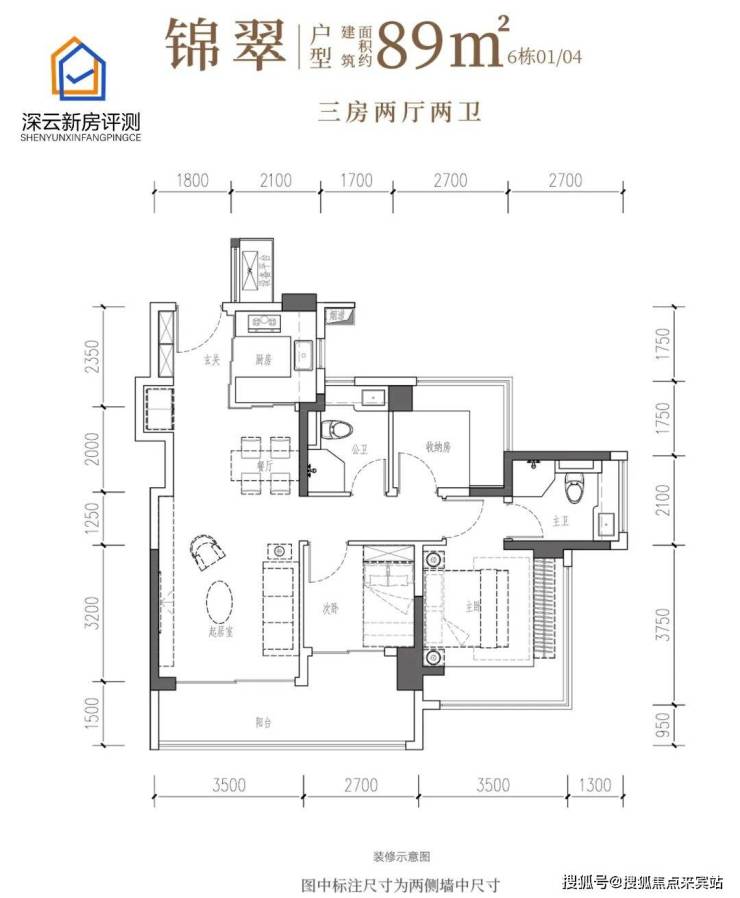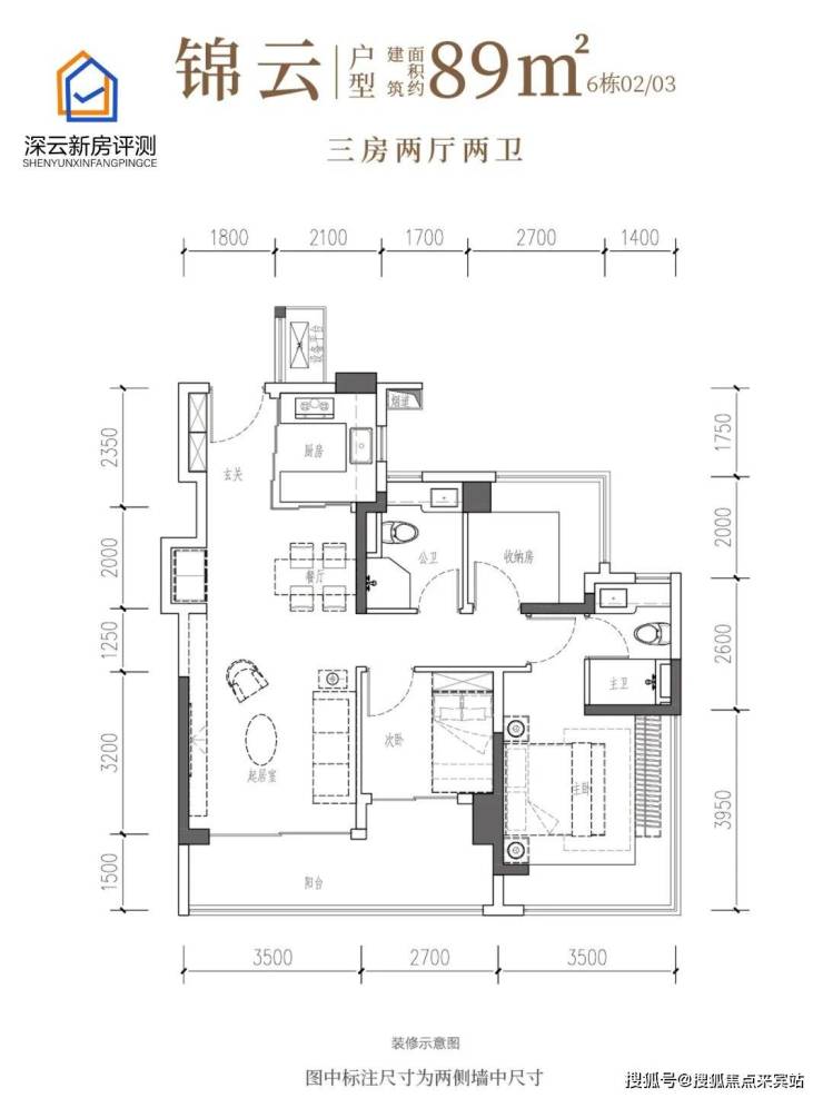 面积:88㎡三房两卫