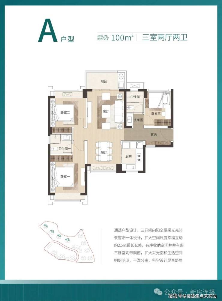 100平:3房2厅2卫,南北通透,使用率79.26%(不包含赠送面积)