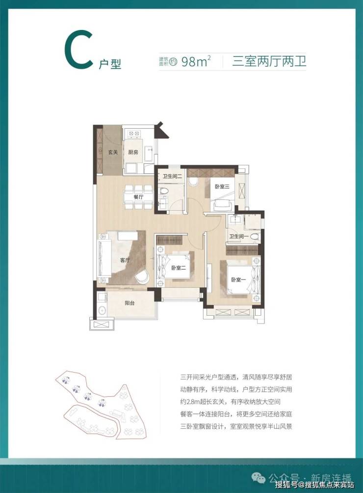 98平:3房2厅2卫,东南/西南,使用率79.26%(不包含赠送面积)