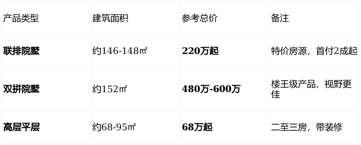 主力户型:项目主力户型包括建面约132㎡双拼、148㎡合院及244㎡大平层。别墅产品通常设计有地下空间、花园及露台,部分户型拥有超8米宽厅,满足家庭聚会及休闲需求 。