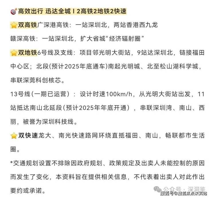 🚇 二、交通2高铁·2地铁·2快速,全城瞬达- 地铁6号线:光明大街站D口出门即达,9站到深圳北- 地铁13号线:科技黄金线,11站直达南山科技园- 双高铁:广深港/赣深高铁,一站深圳北,速通香港、珠三角- 龙大/南光双快速:免费畅达福田、南山上班不堵、出差不累、租客最爱